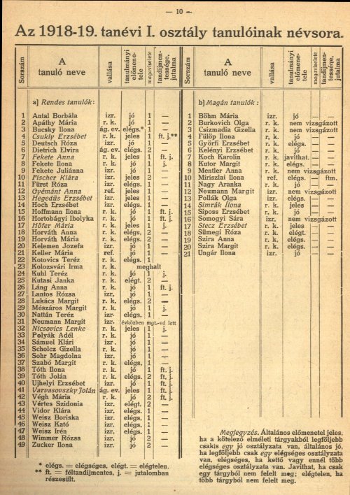 1918-19 tanév I. osztály tanulóinak névsora