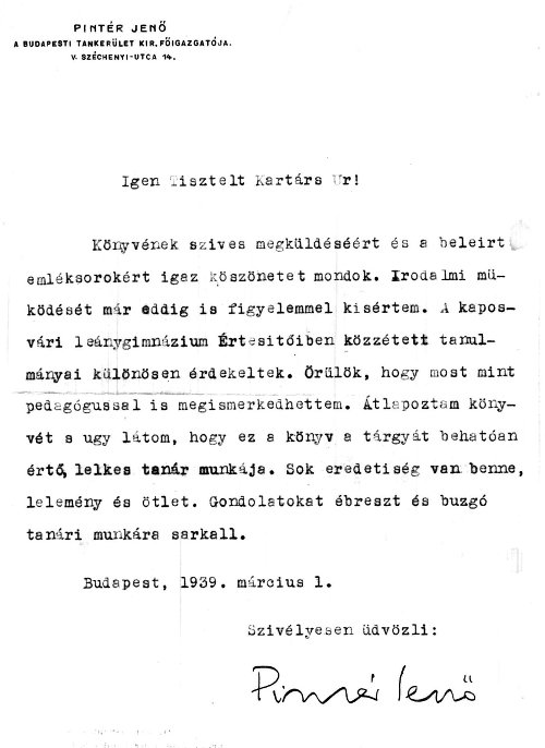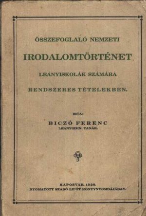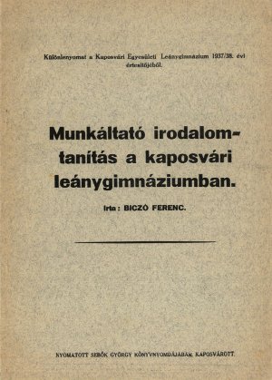 Tanítás módszertani munkáiA tanítás módszertanának ilyen fajta megközelítése a század elején merészen korszerű volt. Biczó Ferenc a tanterv utasításait betartva, az irodalomtanítás fő feladatának azt tartotta, hogy új, aktív olvasókat neveljen, ezzel a módszerrel megtette az első lépést a tanulóközpontú irodalomtanítás felé. (43.) ![]() Biczó Ferenc kollégáival is meg akarta osztani módszertani tapasztalatait, ezért országosan egyedülálló kezdeményezésként megírta módszertani tapasztalatait: ![]() - Első tanítási módszertani munkája 1921-ben jelent meg - a Vajthó László szerkesztette - A tanítás Problémái című sorozat második részeként Az irodalom tanítása a leányiskolákban - címmel. Ez a mindössze huszonhét oldalas írás Vajthó László: Tanulók szerepe az irodalom tanításában - című tanulmánya kapcsán született. Vajthó László ebben művében mutatja meg, hogy hogyan lehet a diákokat bevonni az irodalomtanítás munkájába. Ám Biczó Ferenc szerint "a leánytanulók más okulást és más irányítást várnak az irodalomtól, mint a fiútanulók... A leánylélek sajátos tulajdonságai miatt." Éppen ezért "Őszintém, vázlatosan beszámolok arról a munkáról, melyet az irodalomismertetés terén a kaposvári leánygimnáziumban kifejtettem. Egyúttal azt is ismertetem, hogyan akartam női motívumok, szempontok felhasználásával a magyar irodalom számára olvasó nőket nevelni." - írta. Tanulmányát Biczó Ferenc bekezdésekre tagolja, a bekezdés első sorában megadva a rész fő témáját. Ilyen első bekezdéscím a Leánylélek és az irodalom - ez a rész bemutatja, hogy az irodalom tanárok "írígylésreméltó helyzetben" vannak, mivel ehhez a tantárgyhoz nem kell kedvet csinálni, a diáklányok lelkükből adódóan kedvelik az irodalmat. A tanulmány utolsó bekezdés címe: Az irodalomtanítás legfőbb célja - amit Biczó Ferenc úgy határozott meg, hogy "az el nem múló magyar irodalom számára új és új olvasókat neveljünk." (44.) ![]() - 1929-ben jelent meg a második ilyen témájú munkája Összefoglaló nemzeti irodalomtörténet leányiskolák számára rendszeres tételekben - címen. A könyv előszavából megtudhatjuk, írójának mi volt a célja a könyv közre adásával. "Más érzelmeket, más gondolatokat ébreszt az irodalomtörténet tanulmányozása az ifjak lelkében és másokat a leánytanulók lelkében, ezért szükséges, hogy a leánynövendékek egyéniségüknek és hivatásuknak megfelelő szempontokból is megismerjék irodalmunkat... Összefoglaló vázlataim sorozata gondolatokat akar ébreszteni, tehát befejezettségre nem tart igényt: a vázlatok a teljes befejezést az olvasó lelkétől várják..." A magyar női ideálok története című fejezetet illesztette be Biczó Ferenc még az irodalomtörténeti vázlatok elé, ez a rész bevezető a vázlatokhoz, sajátos hangulatot teremt az "indulás" előtt. "Egy-egy irodalmi mű nagyon beszédes, ha figyelmező lélekkel hallgatjuk: elmondja régi, elmult korok leányainak álomvilágát, érzelmeit... Az irodalom számunkra tehát körülbelül az, ami az életrajz az egyes ember számára: irodalmunk a magyarság életrajza... Minden korszakban kialakul egy női ideál, amelynek emlékét őrzi irodalmunk..." Ennek megfelelően Biczó Ferenc 30 főfejezetben és további 7 alfejezetben tárgyalja korszakonként a magyar női ideál megjelenést. (45.) ![]() - Az 1937/38-as iskolai évkönyv közli a következő tanulmányt Munkáltató irodalomtanítás a kaposvári leánygimnáziumban - címmel. Biczó Ferencnek ez a munkája előzetese volt 1939-ben kiadott A magyar nyelv és irodalom korszerű tanítása - című könyvének, ezt tudatja is velünk a tanulmány végén szereplő tanulságok - című fejezetben. Itt azonban megtudhatjuk azt is, hogy "Amint a szabadesés irányította már akkor is a fizikai világot, mikor Newton még le sem írta a 'gravitáció1, az általános nehézkedés törvényét, úgy az iskolában is még akkor is működött a munkáltató tanítás szelleme, mikor még a pedagógia ezt a szót nem is használta." Ennek a tanulmánynak a tanulságai között megtalálunk számos olyan gondolatot, amit a későbbi könyvben kiemelt fejezeti alcímként láthatunk viszont, például: "...sokat tanultam tekintélyes könyvekből, de legtöbbet... tanítványaimtól." (46.) ![]() - 1939-ben tehát kiadták A magyar nyelv és irodalom korszerű tanítása - című pedagógiai munkáját, mely szándéka szerint a tanárság útmutatójául íródott. "Én pedagógiai beszámolót, műhely-naplót nyujtok át az érdeklődő kartársaknak... Szeretném ha könyvemből a kartársak az óra utáni pedagógiai lelkiismeretvizsgáló csendben azt a bátorítást, biztatást kapnák Somogyország fővárosából: Vagyunk sokan, akik keressük a legjobb órákhoz vezető utat. S töretlen hittel hisszük, egy-egy óra kudarca után is, hogy érdemes a legjobb magyar óráért harcolni." Biczó Ferenc könyvét fő- és alfejezetekre tagolja. Az első főfejezet címét - Elmélet és gyakorlat - már ismert alcím követi: Sokat tanultam tudós szerzőktől, de legtöbbet mégis tanítványaimtól. A fejezetek alcímei máshol is figyelemfelkeltőek. Például: A passzív óra című, ahol az alcím így szól: Az iskolában untatni bűn; Az óra dramatizálása - című fejezetnél Minden, ami élénkíti a képzeletet, könnyíti a tanítást; Szemléltetés - című fejezet alcíme: A szemléltető eszköz valóban a bölcsek köve, de ha nincs mellette a bölcs, akkor csak kő marad. Biczó Ferenc a könyv végén a tanulságokat is levonta nekünk: "A tanítási óra... csata, amelyet a valóság sok véletlenje kísér. A katedra nem stratégiai asztal... Az iskola két hőse, a diák és a tanár sok-sok előre nem sejtett nehézségre bukkan, am