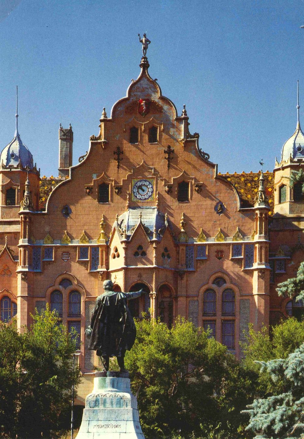 A város jelképe az épület, homlokzatán a város címere, amit tulipánok és magyaros növényi ornamentika vesz körbe gazdagon. A kerámiadíszek, a változatos színű tetőcserepek a Zsolnay gyárból származnak. A sarkon álló 45 m magas torony messziről hirdeti a városháza pompáját. A buja díszítés keleties benyomást kelt. Az épület belseje méltó a külső megjelenéshez.
