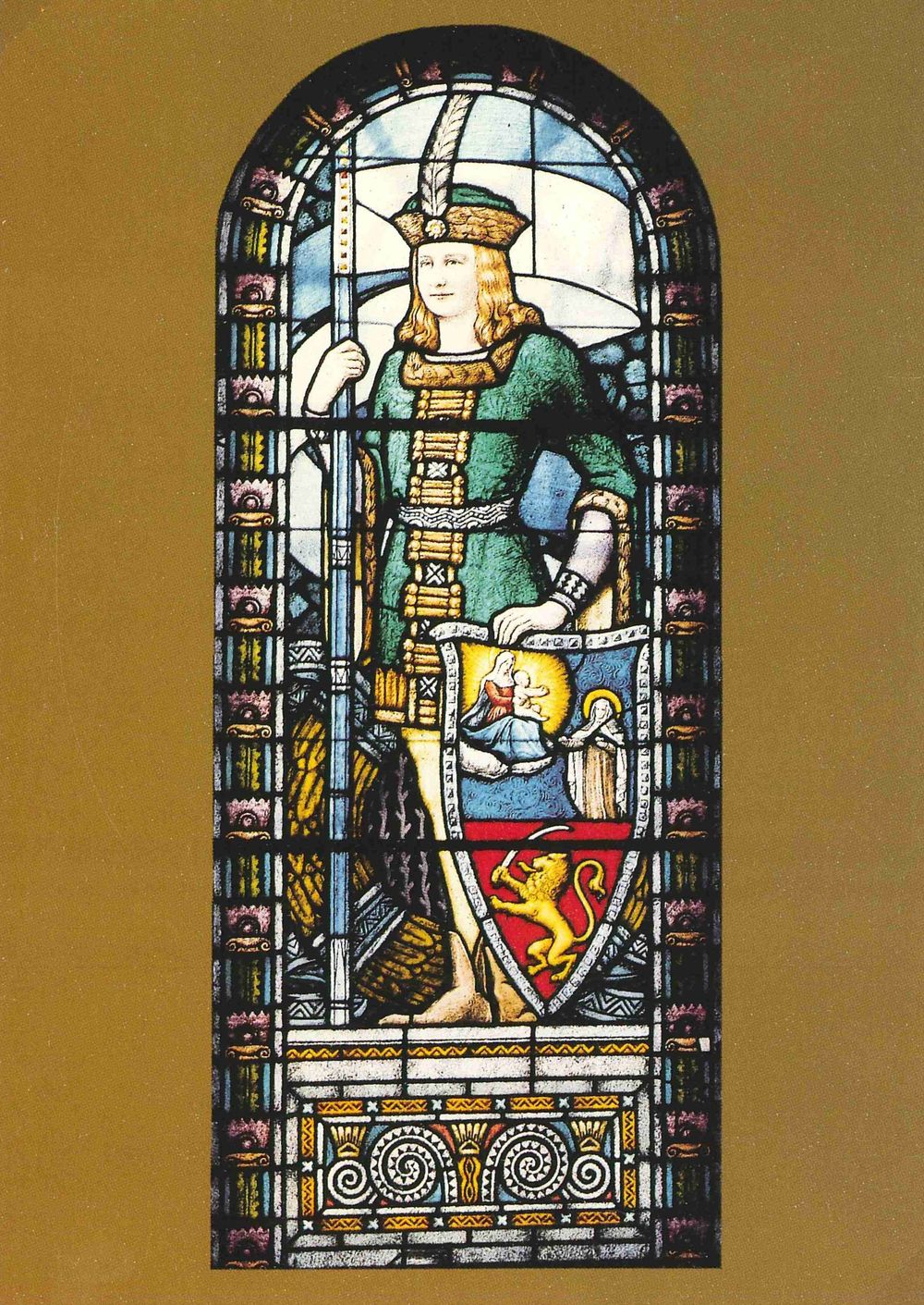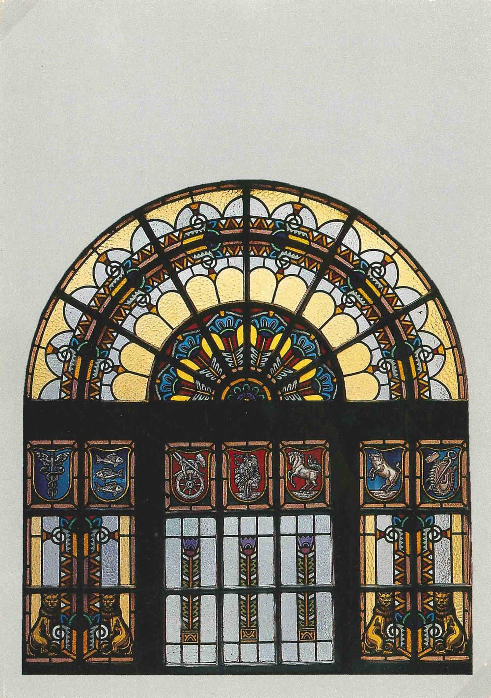 Üvegfestmény a Városháza díszbejáratán.