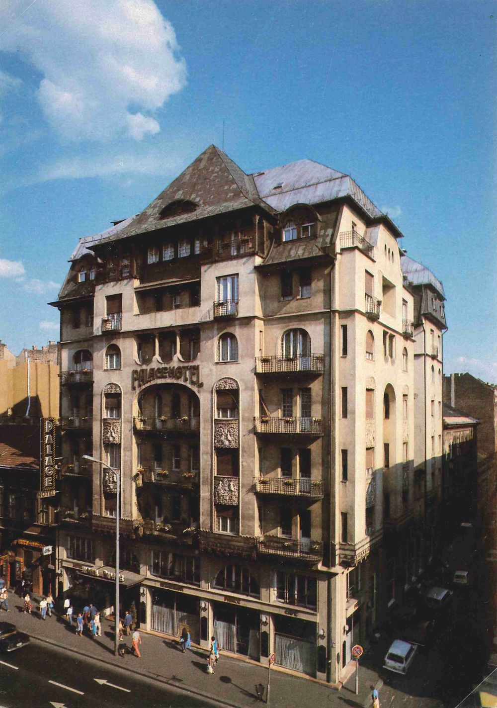 A Palace hotel a magyaros szecesszió egyik utolsó épülete a fővárosban. A homlokzat alsó két szintjét Zsolnay - kerámiával burkolták, a felette lévő szintekre népi motívumos, kovácsoltvas erkély korlátok kerültek. Népi motívumok díszítik az alsó szinteket is. A homlokzat legfelsőbb szintjén színes sgrafitto látható, fölé került a faragott, festett faszerkezetű tetőfelépítmény.