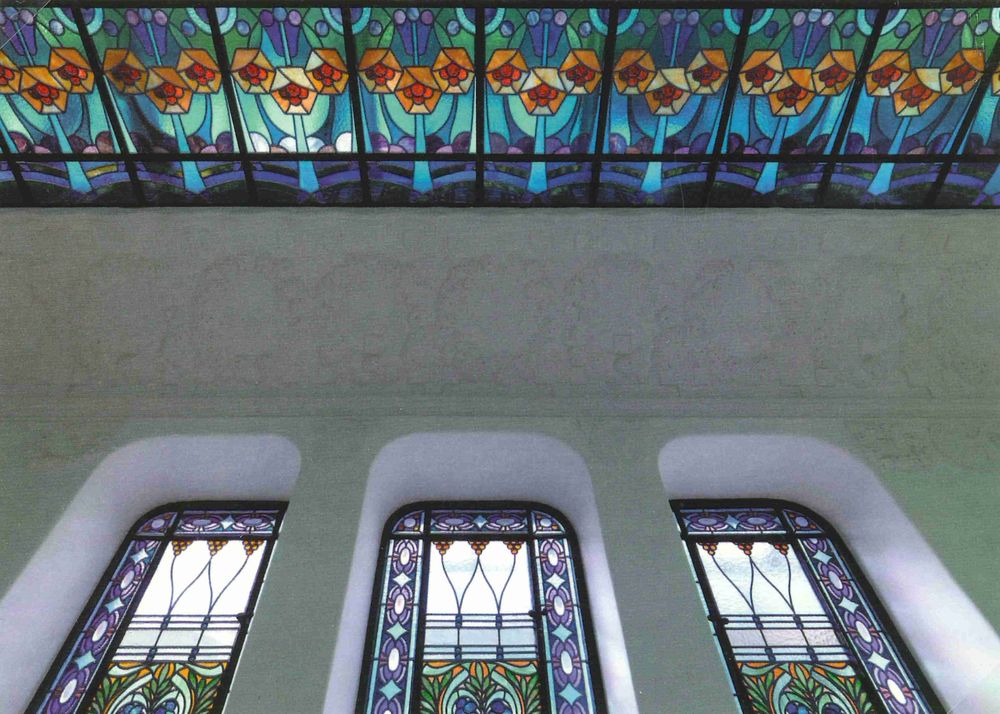 Az ólombetétes ablakok Róth Miksa műhelyéből kerültek ki. Kár, hogy a három lépcsőház üvegablakaiból sok elpusztult, így Gresham portréja is. A „Kossuth lépcsőház" azonban megmaradt, a névadó élethű, dagerrotípiáról készült, gyönyörűen megfestett portréja került az ablak közepére.