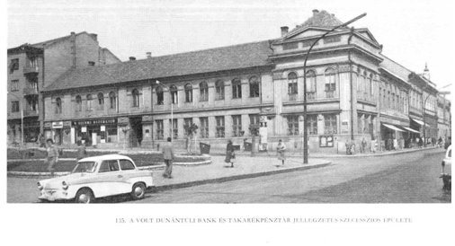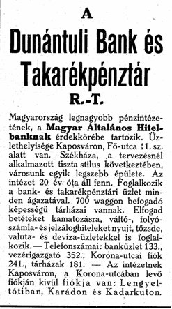A Dunántúli Bank építése során nyílott meg 1928-ban a Kossuth Lajos utca. A város fejlődési ütemét meghatározta, hogy a Magyar Általános Hitelbank kaposvári érdekeltséget szerzett 1890. november 1-jén.2 A gazdasági élet zavartalan körforgásához ugyanis pénzre volt szükség. Hét tekintélyes pénzintézet szolgáltatta Kaposvár és vidékének közönsége számára ezt a létfeltételt 1928-ban. "Ezek az intézetek: Somogymegyei Takarékpénztár, Dunántúli Bank és Takarékpénztár, Kaposvári Takarék, Gazdasági és Ipari Bank Rt., Magyar Általános Takarékpénztár Kaposvári Fiókja, Kisgazda és Kisiparos Takarékpénztár, Kereskedők és Iparosok Takarékpénztára, Kaposvári Bank Rt."3 A Dunántúli Bank és Takarékpénztár Rt. 1921-ben létesült a Dunántúli Agrárbank Rt. (1909) és a Néptakarékpénztár Rt (1907) egyesüléséből. Régi székháza a Fő utca 17. szám alatt volt. Homlokzatán ott szerepelt a méhkas, a takarékpénztárak szimbóluma. Az új épület tervezése Lamping József nevéhez fűződik, aki az 1910-es, 20-as években igényes, szép középületeket, lakóházakat tervezett Kaposváron. Az építész itt is bizonyított (1928). Sikerült megvalósítani a bankszékház legfontosabb funkciót, hogy erőt és stabilitást sugározzon az épület. Zádor Mihály szerint: "higgadtabb szecessziós stílusú" épület, mely a megyeház formaképzését tükrözi.4 A Kaposvár és környéke című útikönyv (2002) viszont klasszicista stílusúnak említi a bankot, ami a XX. század elején épült bankokra volt jellemző. |