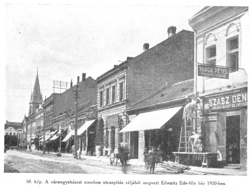 Ezen a helyen állt az a ház, amelyben Kozma Sándor ügyvéd, főszolgabíró, országgyűlési képviselő, Magyarország első királyi főügyésze lakott. A Kossuth utca felőli oldalon emléktábláját láthatjuk, amelyet 2000-ben avattak fel. A vármegyeházzal szemben álló Eibenitz-féle házat 1910-ben vásárolta meg a város utcanyitás céljából.1 (A mai Kossuth Lajos utca és az Európa park csatlakozása.) |