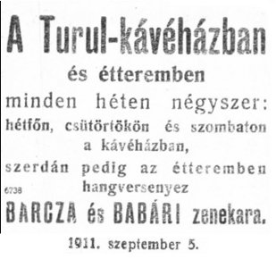 A híres cigányprímás, Szimpliciusz (Barcza József) és zenekara muzsikált a közönségnek. "Rippl-Rónai József kezdeményezésére 1912-ben nagy ünnepséget terveztek Szimpliciusz működésének negyvenéves évfordulójára. De hálátlan volt Kaposvár közönsége. Azok, akiket negyven éven keresztül szórakoztatott, még arra sem méltatták, hogy elmenjenek a Turul kávéházban megrendezett ünnepségre"4 |
