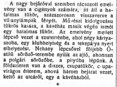 A szálloda és a kávéház a módosabb polgárság és a nagybirtokos réteg találkozóhelye volt. A földszinten kávézó, biliárdterem, a pincében étterem üzemelt. A kávézó állandó vendége volt Rippl-Rónai József, aki tárlatot is rendezett itt. Öccse, Rippl-Rónai Ödön a Turul Szálló éttermében művészasztalt tartott fenn. A kellemes időtöltéshez hozzájárult, hogy a kávéházba naponta húsz-harminc bel- és külföldi újság járt, amelyeket különleges újságtartón lehetett olvasni. "Minden napilap fogantyúban végződő két léc közé szorult, s e lécekből drótok ágaztak ki, hogy az újság azokon feküdjön, s így az olvasásra kényelmes felületet nyújtson"3 |