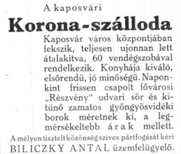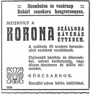 "Az étteremhez tartozott a Korona kávéháza. Itt zajlott le a felsőbb társasági körök élete, és itt szereztek híreket a világ dolgairól, a 'falakon kívüli világról' a város érdeklődő polgárai, főként az újságírók és kupecek. És hogy illetéktelen személy mégse láthasson bele a kártyáikba, a bejárathoz egy táblát akasztottak ezzel a felirattal: 'A kávéház helyiségeiben a törzsvendég urakon kívül és az utazó urakon kívül csak azok a vendégek tartózkodhatnak, akik valamit fogyasztanak, vagy biliárd és kártyajátékok által nyújtanak a kávéháznak bevételt, mert végre is a kávéház nem nyilvános, ingyenes melegedőhely és újságolvasó helyiség."5 |