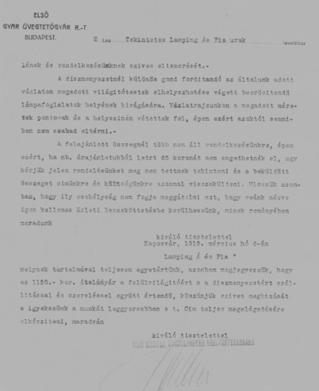 Lamping József megrendelőlevele az üvegtetőgyárnak