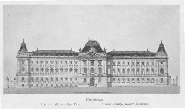 "Az épület szabadon álló, kétemeletes, két belső udvaros, gazdagon díszített középület a Bajcsy-Zsilinszky és Kossuth Lajos utca sarkán. Főhomlokzata tizenkilenc, oldalhomlokzata nyolc-nyolc travéból áll."4 |