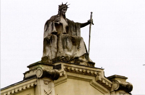 Justitia, az igazság görög istennőjének mészkő szobra látható az épület oromzatán. A szobor különlegessége, hogy a szokásostól eltérően bal kezében tartja a pallost, jobb kezében a mérleget, és nincs bekötve a szeme. A városra tekint, mert "a jogrend az embereknek szól".3 |