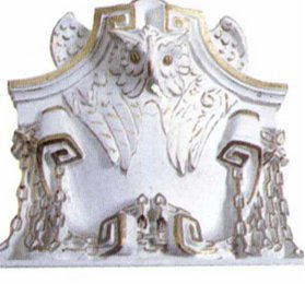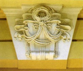 "A szobrászati díszítmények között fontos szerepet kapott a stukkó. Mivel gipszből készül, lehet, hogy olcsósága miatt használják előszeretettel, s mert igen alkalmas a jelképrendszer meggyőző kifejezésére. A stukkódísz, legyen az ornamentális vagy figurális ábrázolás, megjelenik a bírósági épületek lépcsőházaiban, dísztermeiben és tárgyalótermeiben is, többnyire fehér, arany díszítéssel."5 |
