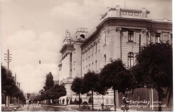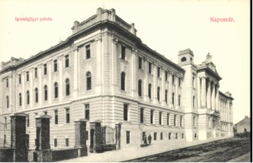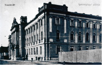 A század elejének leghangsúlyosabb, legszebb középülete Kaposváron, amely a városkép alakításában is szerepet játszott. A budapesti Legfelsőbb Bíróság, a Királyi Kúria palotája ihlette a Somogy Megyei Bíróság épületét. Az építés iránti szükséglet már 1889-ben megjelent, mert a Megyeház épületében elhelyezett bírósági hivatalok szűkösnek bizonyultak. (Kaposvár,1891. december 13.) 1901-ben a Meggyes-telken kijelöltek egy területet (Esterházy és Árpád utca sarok) megfelelő méretű igazságügyi palota és fogház építésére. Az igazságügyi miniszter elfogadta a vármegye ajánlatát (Kaposvár, 1901. április 11.). Az építkezés híre megnövelte a környéken a telekvásárlási kedvet. 1902-ben tervpályázatot íratott ki az igazságügyi miniszter az épületre. (Kaposvár, 1902. október 5.) A pályázatot Károlyi Emil, Márton Ákos, Riemer Márkus pécsi építészek nyerték meg. A kaposvári törvénykező épület és fogház első díjas pályaterve megjelent a korabeli építészeti szaklapban. A kaposvári törvénykező épület és fogház pályatervei = Magyar Építőművészet, 1904 - 1905. |