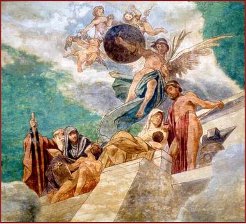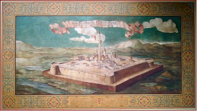 A legfőbb mesterségek (ipar, kereskedelem, tudomány, művészet, földművelés) szimbolikus ábrázolása és a címer díszíti a városháza legszebb üléstermét |