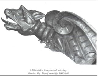 A Városháza tornya 40 méter magas a csúcsdísszel együtt. Háromszor újították fel. 1960-ban Kovács Gy. József készített másolatot a négy sárkányos vízköpőről. |