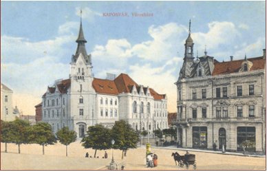 Az 1800-as években Kaposvár falusias külsőt mutatott. Németh István (1895-1911) polgármester nevéhez fűződik a 20. század elején a település várossá fejlődése. Számos kulcsfontosságú középület épült fel ebben az időben. A városkép szempontjából meghatározó épület a Városháza, amely a város főterén áll. Kaposvár történelmi központjának fő épülete az észak-dél (Balaton-Szigetvár) és a kelet-nyugat (Pécs-Nagykanizsa) irányú forgalom kereszteződésében állt hosszú ideig, az egykori utakon ma gyalogos közlekedés van. "Az épület késő eklektikus stílusú, a német reneszánsz formáinak kései követője, tehát stílusát tekintve neoreneszánsznak nevezhető. Erről tanúsodik a kváderköves sarokkialakítás (sarokarmírozás), az oromzatos torony és az utcai homlokzatok meredek hajlásszögű oromzatai, az ablakkeretezés, az erkélymegoldás stb."1 A szecessziós díszítés kiemelkedő darabjai az épületen található üvegablakok, műlakatosmunkák, fafaragások. |