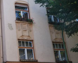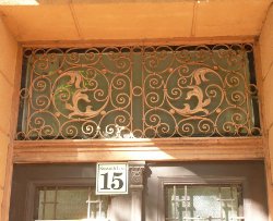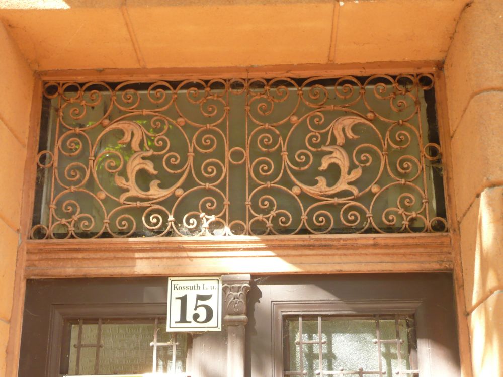 Dausek Géza tekervényes, stilizált növényi indázatú műlakatos kigészítőket tervezett erre a házra. A Kossuth Lajos utca családi házain a kapuk többsége Dausek munkája.(2, 4, 6, 8,10, 15, 16, 18, 36, 39, 70). |
