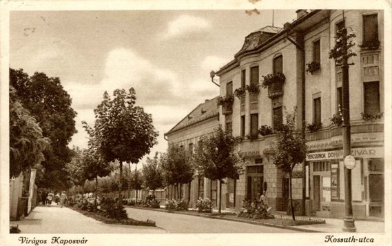 A virágos Kaposvár mozgalom az 1920-as 30-as években vált országosan ismertté. A város egyik legszebb virágos utcája volt a Kossuth Lajos utca. (a képeslap is erről készült, a Bajcsy-Zsilinszky utcai sarok házzal). Az utca fáit a múlt század elején ültették. Évszázados tiszafa, császárfa, ezüstfenyő díszíti a polgárházak udvarát ma is. |