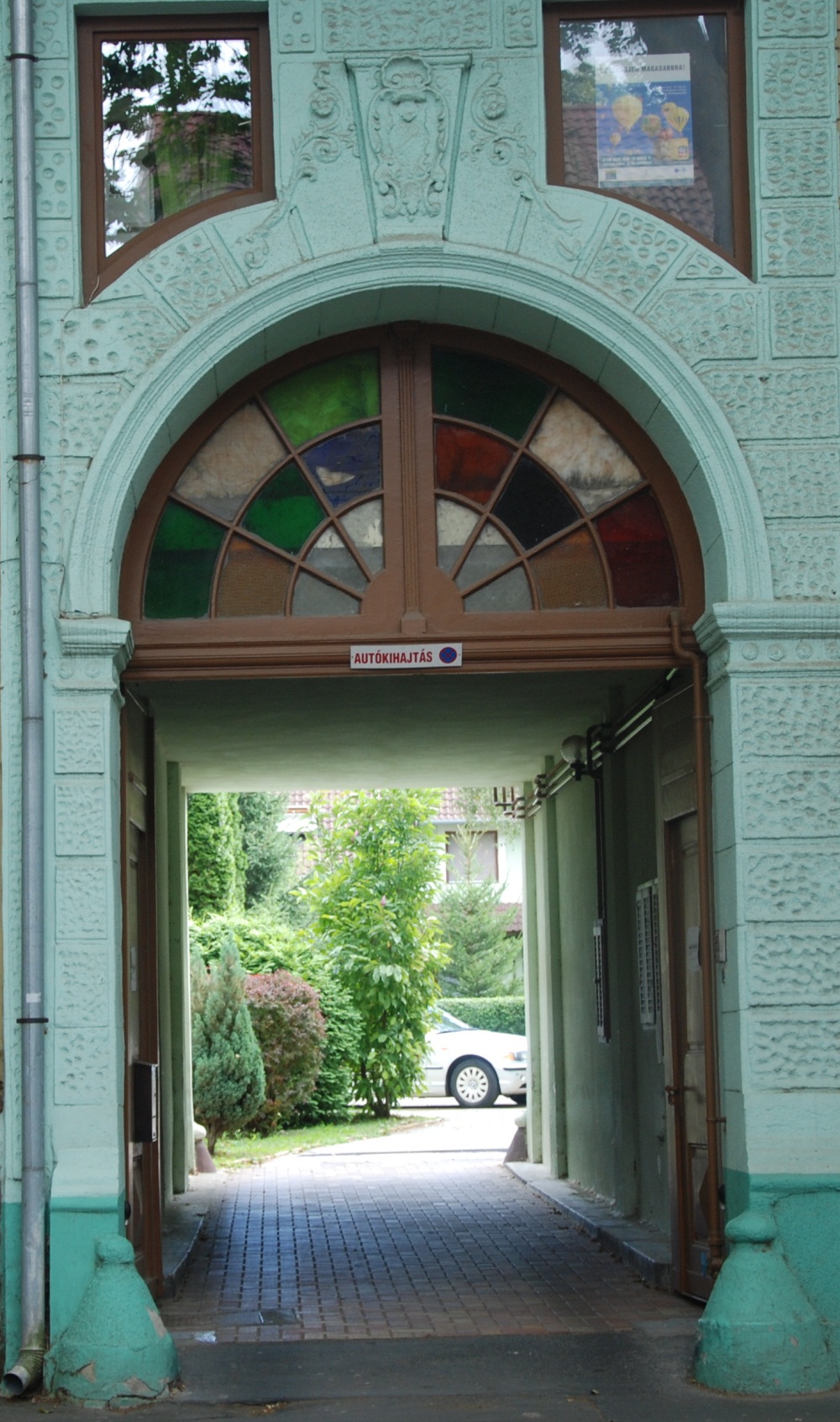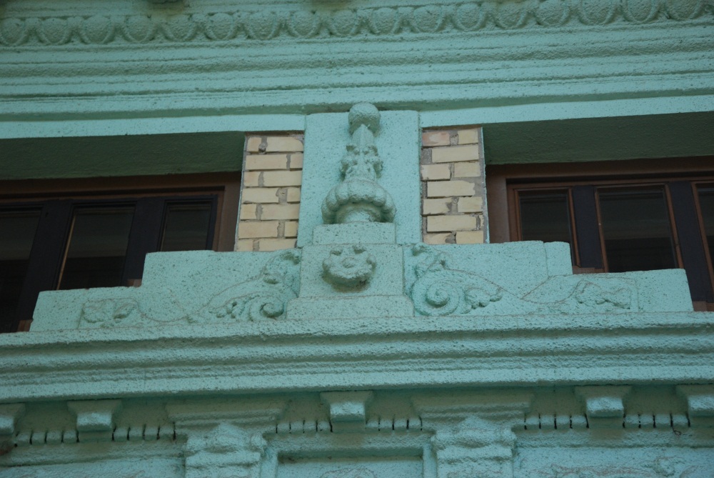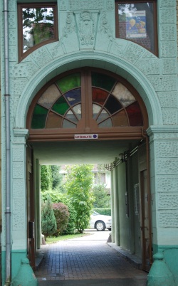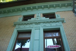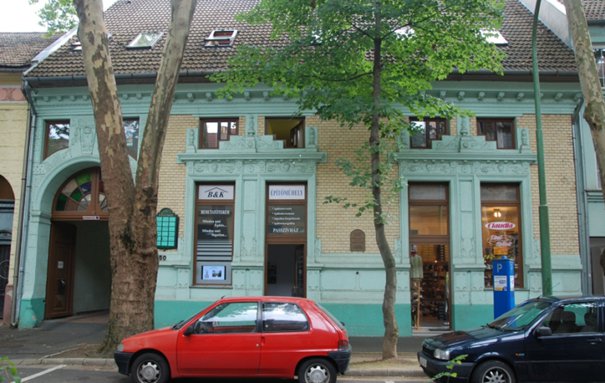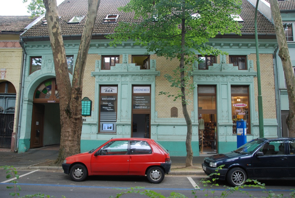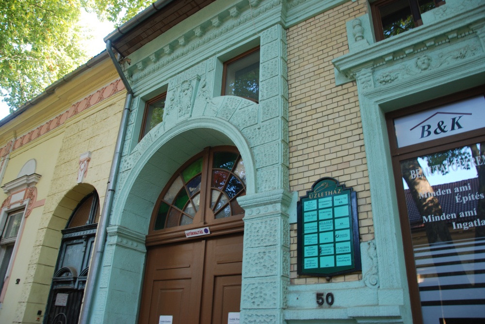 "Erősen átalakították a polgári lakóház homlokzatát, az egykori ablakok helyett kirakatok és üzletbejáratok készültek, és a belső átépítés miatt a szemöldökpárkány fölé új ablaknyílásokat vágtak. A sárga színű, téglaburkolatú falon az eredeti kettős ablakok és az íves záródású kapu körül plasztikusan formált vakolatkereteket készítettek. Az ablakok felső széle és a két ablakot összefogó szemöldökpárkány közötti növényi motívumokból álló vakolatdíszítés utal a szecesszió formavilágára." (Fábián Éva építész közlése) |