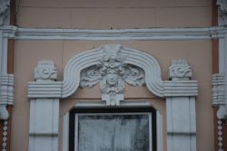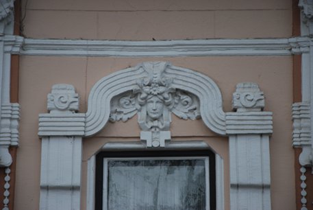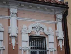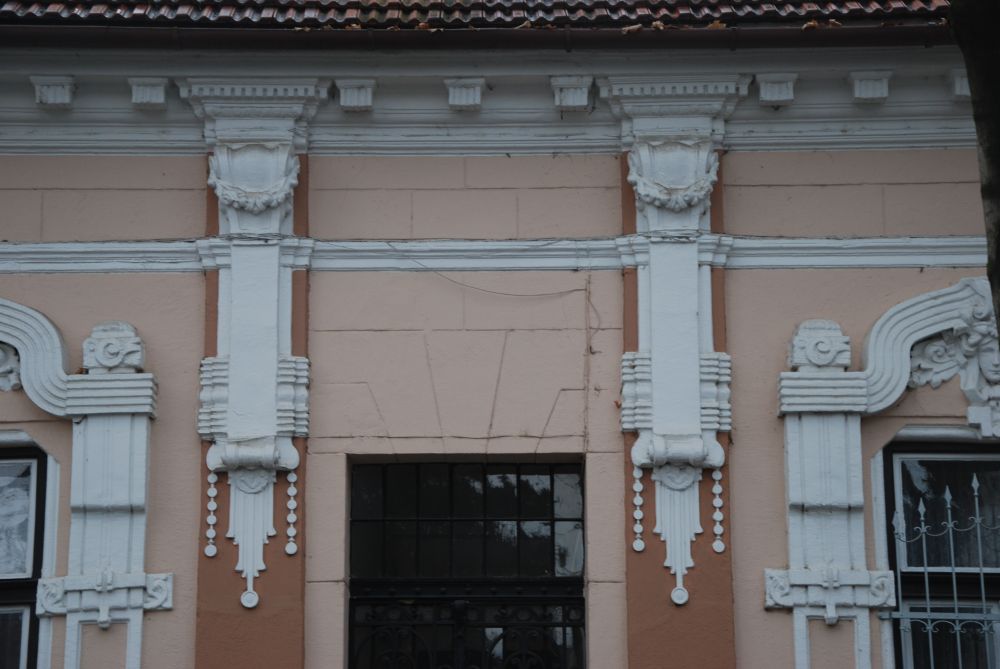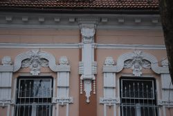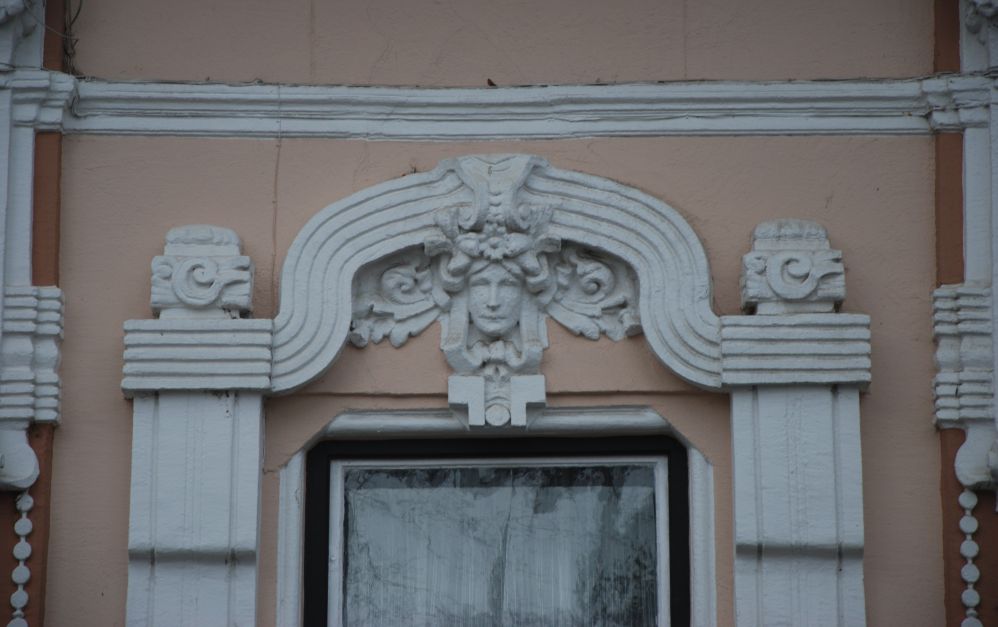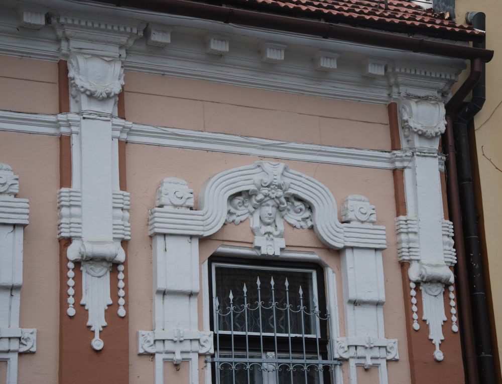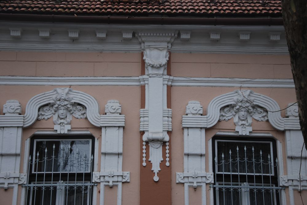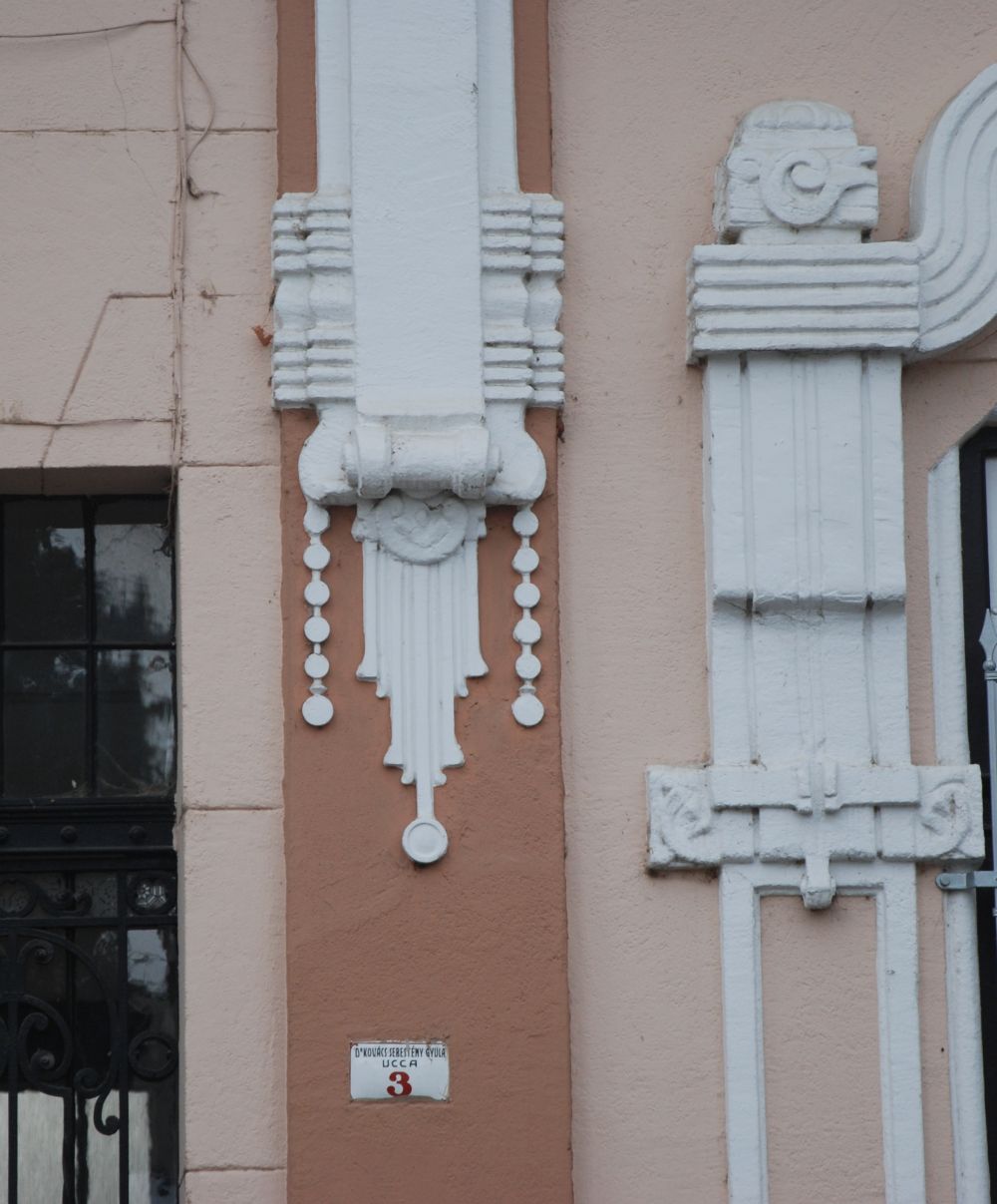 "Az ablakok felett széles, lendületes ívelésű, szalagszerű sáv fogja össze az ablak melletti tagozott, függőleges vakolatdíszt és az ablak fölötti emberfejet keretező levéldíszítést. A szokványos, egyenes záródású szemöldökpárkány helyett alkalmazott kétszer ívelt sávos díszítés teszi különlegessé és szecessziós hangulatúvá a homlokzatot." (Fábián Éva építész közlése) |