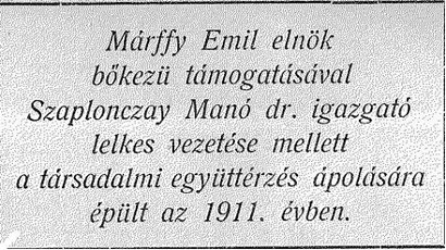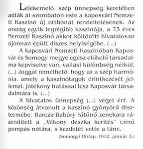 "Szaplonczay Manó dr. igazgató a kaposvári mérnök- és építészegylet kaszinótagjait kérte fel, hogy az adott építési programot vázlatos tervben akként oldanák meg, hogy az építés a Somogy megyei takarékpénztár által kilátásba helyezett 80 000 koronás kölcsön s a kaszinó 8000 koronát kitevő építési alapjából megvalósítható legyen. A bemutatott vázlatos tervek közül a választmány Molnár Endre építész vázlatait fogadta el, s megbízta őt annak kidolgozásával."3 A kaszinótagok új otthona 1911 decemberében készült el, megnyitó ünnepélye rangos esemény volt a városban. (Somogyi Hírlap, 1912. január 3 - 4) |