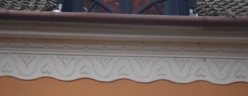 A Lechner Ödön által kialakított magyar formanyelvet a vidéki építészek is követték. Az épület ornamentikájának kialakításánál a népművészethez fordultak. Ezt tette Gáspár Gyula is a 31. számú házon a tulipán és a szív motívumának felhasználásával. A tulipánt a magyarság jelképei közé sorolhatjuk. "E virág nem csupán ugyanabból a földből született, amelyből a magyarság, hanem nyelvünk, világnézetünk kialakulásának is részese..."6 A szív a tulipánnal összekapcsolva, egymásba rajzolva szerelmi üzenetet közvetít Hoppál Mihály jelképtára szerint. |