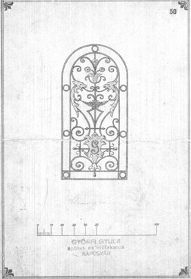 A kaposvári lakatosmesterek 1880-tól olasz, német, magyar tervezők műipari mintalapjainak felhasználásával is dolgoztak. Papp Mihály egy ilyen tervet módosítva készítette el a Bajcsy Zsilinszky utca 25. számú lakóház kapujának betétrácsait. A levéldíszítések és sárkányfejek kézi munkával készültek. Mindez "a szemek, és az orrlyukak kialakításán látható bemélyedések, domborulatok, ívhosszok 1-2 mm-es eltéréséből állapítható meg."5 A kitűnő iparos műremekei a Táncsics Gimnázium Bajcsy-Zsilinszky utcai homlokzatán található sárkányfejes zászlótartók is. Az egykori Esterházy utca 25. számú ház tulajdonosa Karai János volt, akinek monogramja felkerült kapura. (Ma a Somogy Megyei Területi Agrárkamara épülete.) |