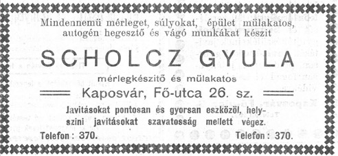 A Fő utca 26. szám alatt levő műhelyében helyeztek először üzembe oxigén-acetilén hegesztőkészüléket. A Kaposvári Ipartestület Fémiparos Szakosztályának elnöke volt. Tragikus hirtelenséggel hunyt el 1924-ben. Halála után a műhelyt fia, ifj. Scholcz Gyula vezette tovább.