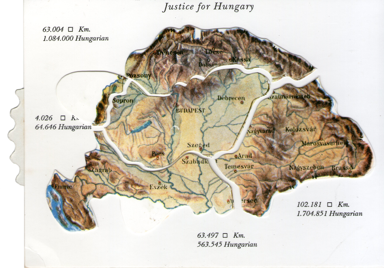 | A trianoni békeszerződés, békediktátum Magyarország 282 ezer km2-nyi területéből 93 ezer km2 területet hagyott, lakossága pedig 18 millióról 7,6 millióra csökkent. Színmagyar lakosságú vidékeket csatoltak el, több mint 3 millió magyar került kisebbségi létbe. Területeiből, javaiból hat ország kapott: Csehszlovákia, Románia, a Szerb–Horvát–Szlovén Királyság, Lengyelország, Ausztria és Olaszország. | ||
