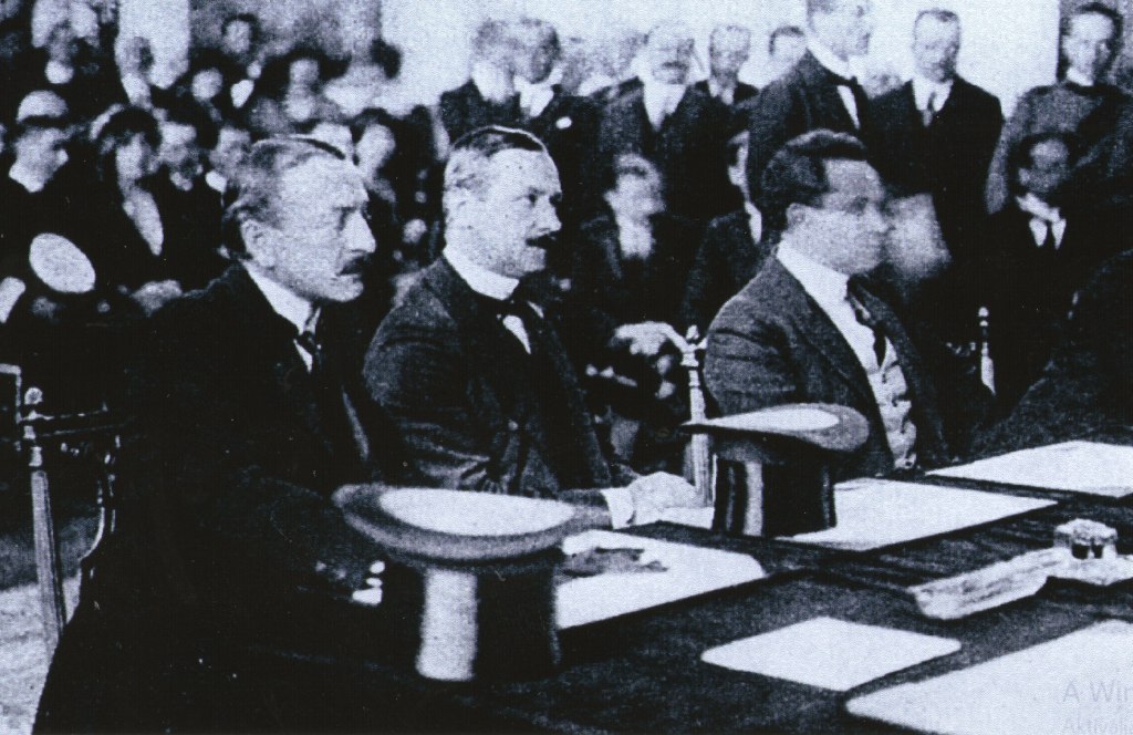 | A békeszerződés aláírói (előtérben): Benárd Ágost népjóléti és munkaügyi miniszter és Drasche-Lázár Alfréd rendkívüli követ és államtitkár. A választás azért esett rájuk, mert a rangos és közismert politikusok egyike sem akarta magát kompromittálni a hazánkra végzetes és máig meghatározó trianoni békeszerződés aláírásával. | ||