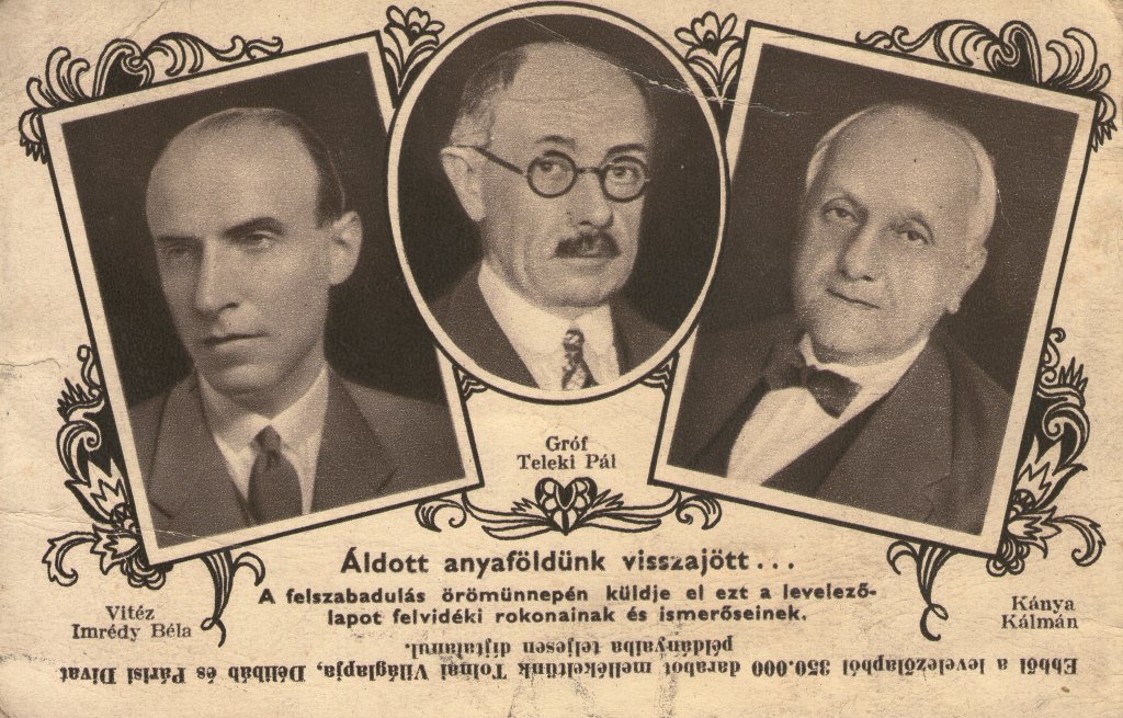 | A képen: Imrédy Béla miniszterelnök, gróf Teleki Pál vallás- és közoktatásügyi miniszter, Kánya Kálmán külügyminiszter (1938) |
